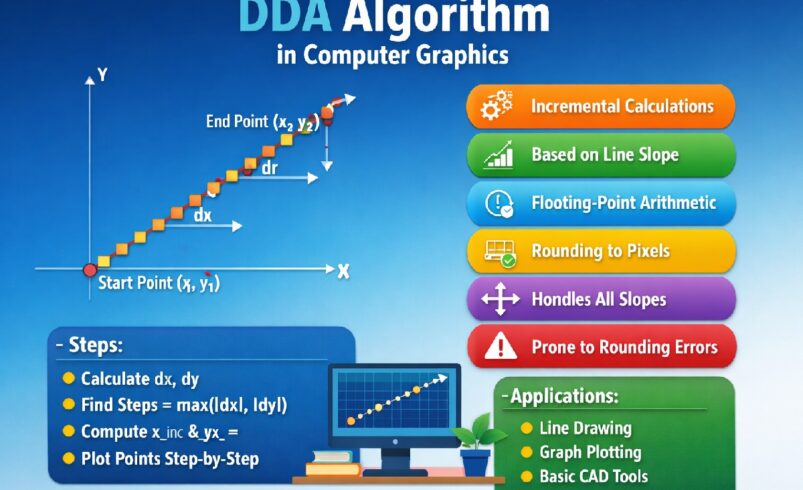 Unlike modern optimized algorithms, DDA relies on floating-point arithmetic, which makes it conceptually simple but slightly less efficient. However, its ease makes it ideal for learning the basics of computer visuals.